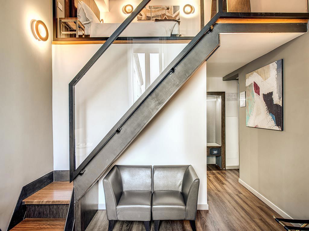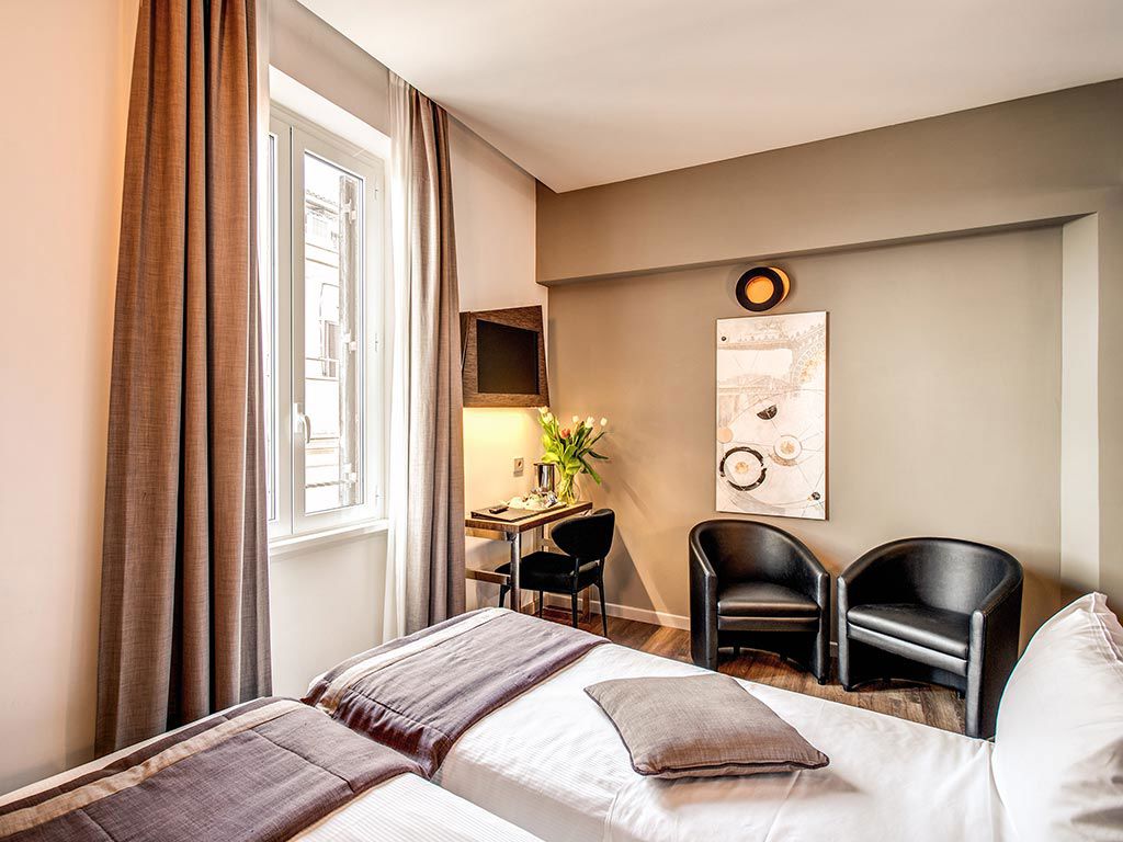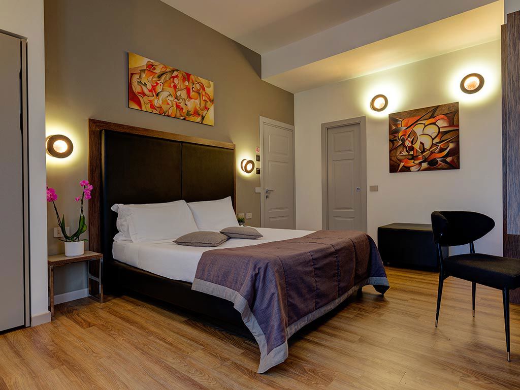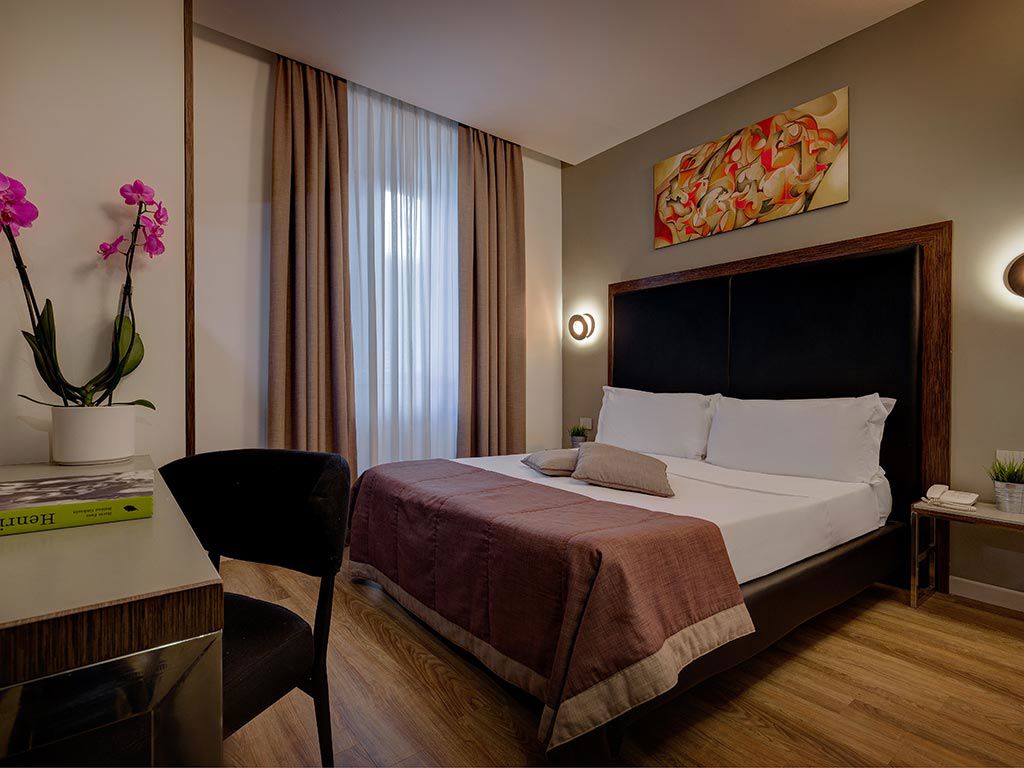 Elements which find their counterpoint in the suites as in the other rooms – single, double, matrimonial, triple or quadruple. Modernism of the grand and luminous windows which open on the city, offering breathtaking views; the ample, enthralling leather or brocade armchairs; the essential lines of the furniture; some still-lifes and landscapes framed to the walls. Aesthetic modernism which marries the comfort of every modern technology or service available to the guests in every room. Between the many housing options, a few unique characteristics catch the eye.
